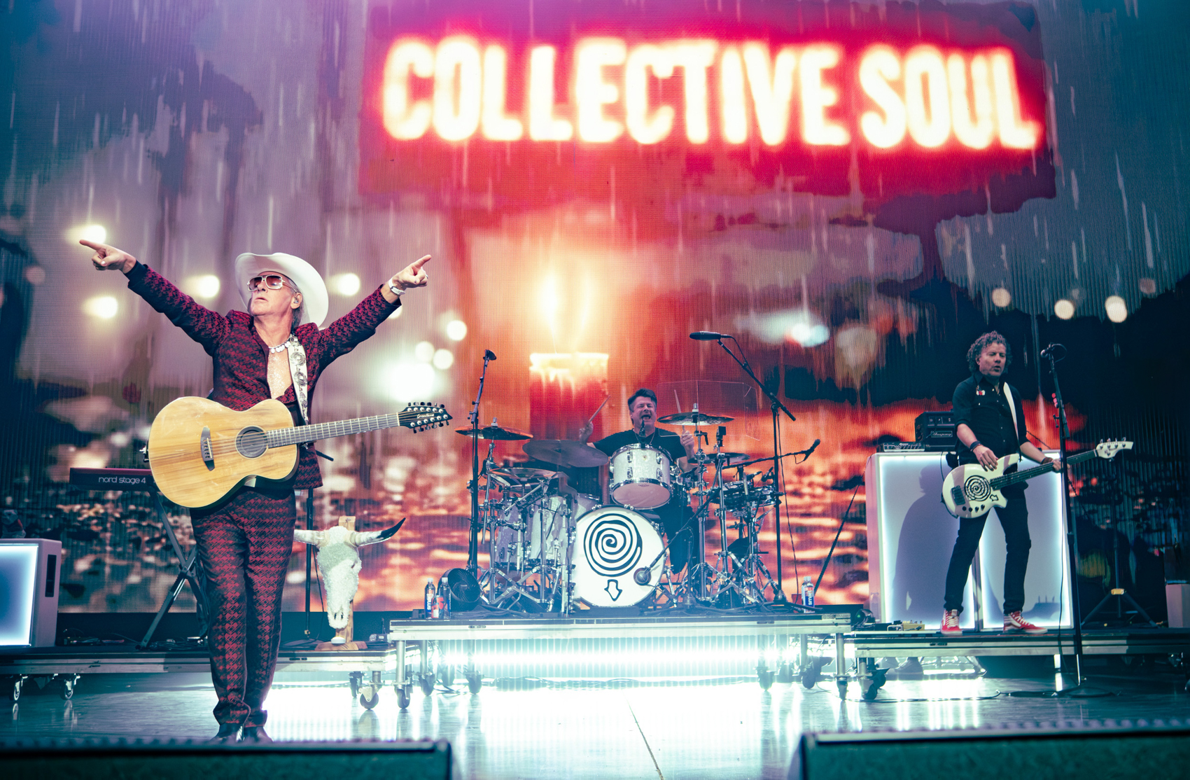 Up next after Live, Collective Soul takes the stage co-headlinging for the first time since 2008. The audience had a long hot day of waiting for all these talented bands but you could hardly see any signs of exhaustion based on their energy and high spirits. Lead singer Ed Roland appears on the stage wearing a red patterned suite, shades and a white cowboy hat.