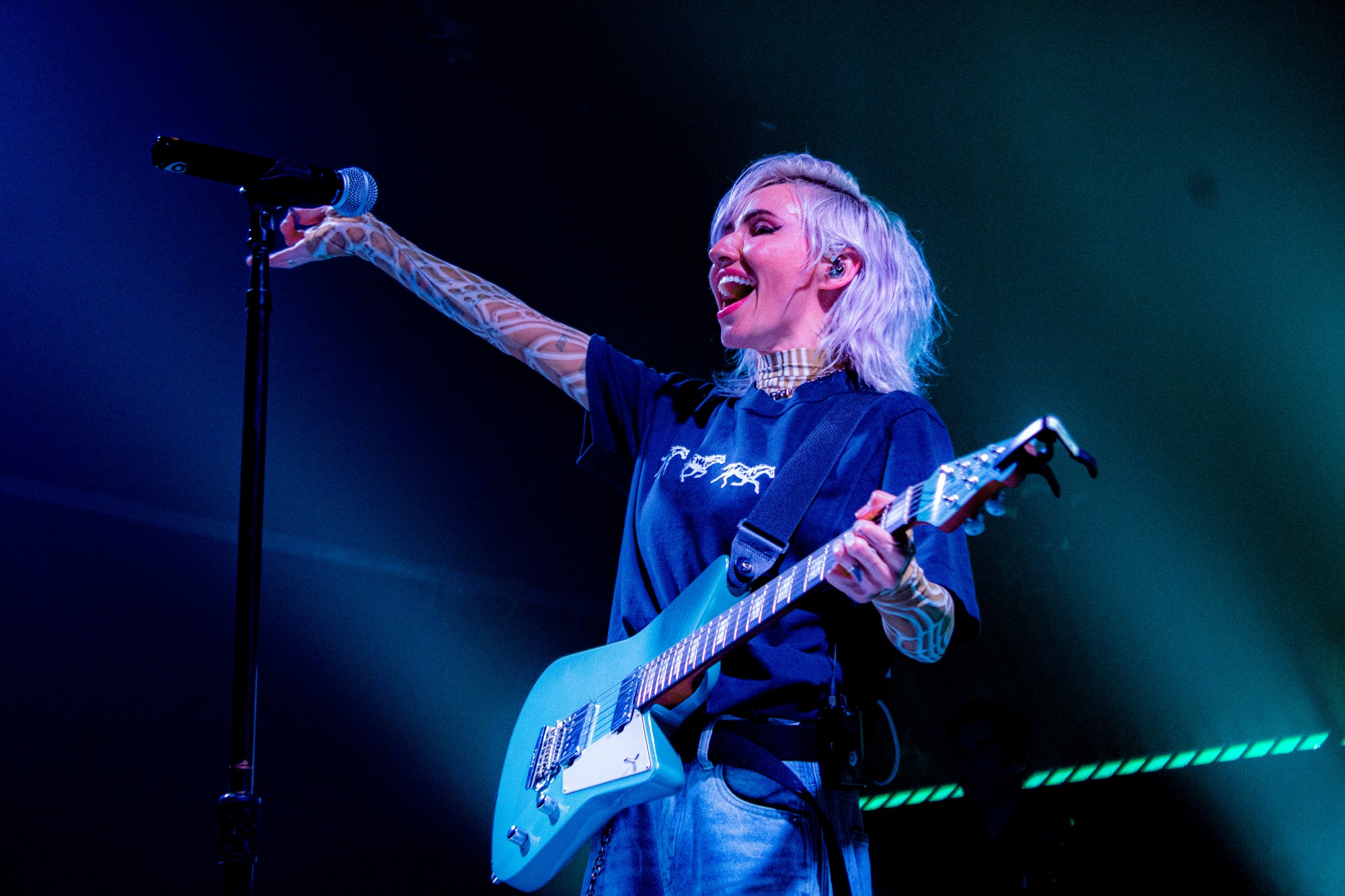 The crowd was swallowed by darkness as a glossy synth rang out across White Oak’s intimate stage. LIGHTS had arrived, opening her set with the tour’s namesake track, “COME GET YOUR GIRL.” Brandishing a bright blue electric guitar, she commanded the room with a natural electricity as her presence elevated the venue from the very first note.