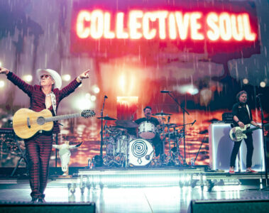 When the clock hit 7pm, the doors finally opened for the fans to prepare for a perfect way to spend an otherwise boring Wednesday night. Whether it was die hard fans of Goth Babe, their opener The Aces, or just a group of pals looking to have an exciting and upbeat night, the people rushed into the pit and their seats to await a blast to come. Plenty of groups decided to spend their time wandering around the pavilion, purchasing big pretzels you could smell from a mile away, or browsing the merchandise. Regardless of where people spent their time before the show, they all ended up inside the venue with energetic cheers as the spotlights shined on the drum set labeled “ACES.”
