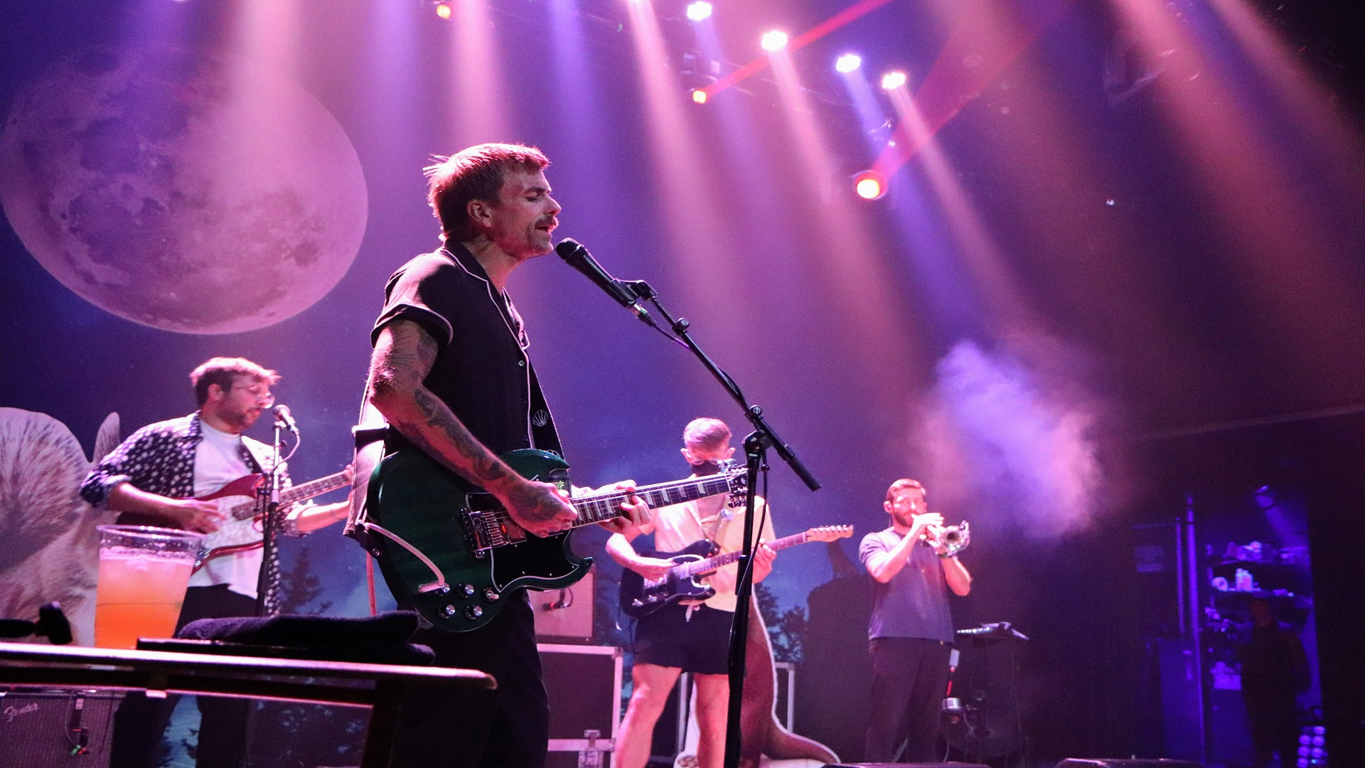 They dove into action with “Baby Girl” as the opener. The crowd screams back with startling enthusiasm as the stage lights up in happy reds and yellows. The album cover features a beach scene printed on a postcard, what seems to be a brown teddy bear coat hung across the back of a beach chair. Following the established vibe, the proscenium stage presents itself to look like a postcard. A giant squirrel and otter hang out under a full moon cutout in the backdrop. Fans seem attached, cheering before curtains when a staff picked the critters up when they fell.