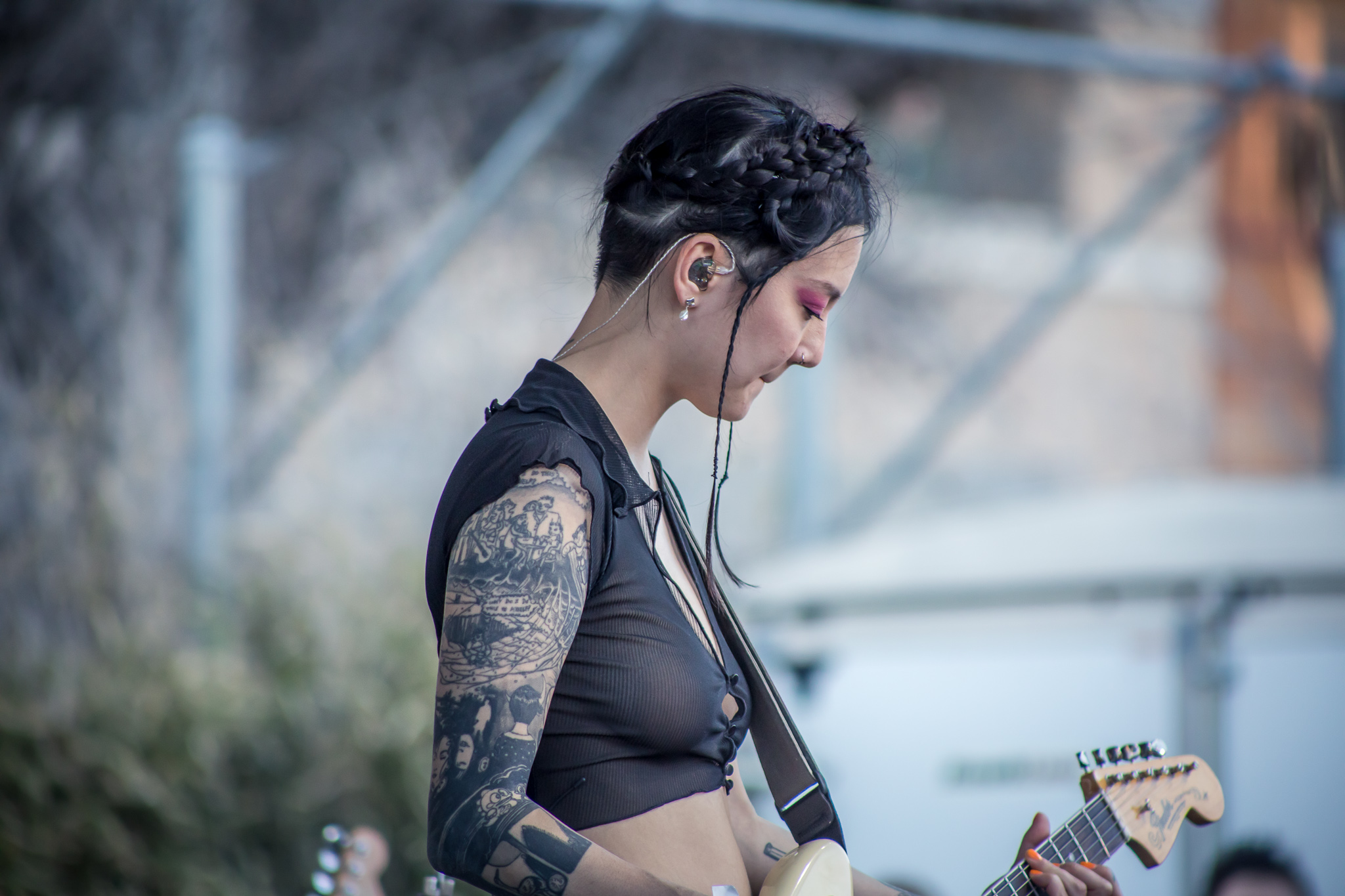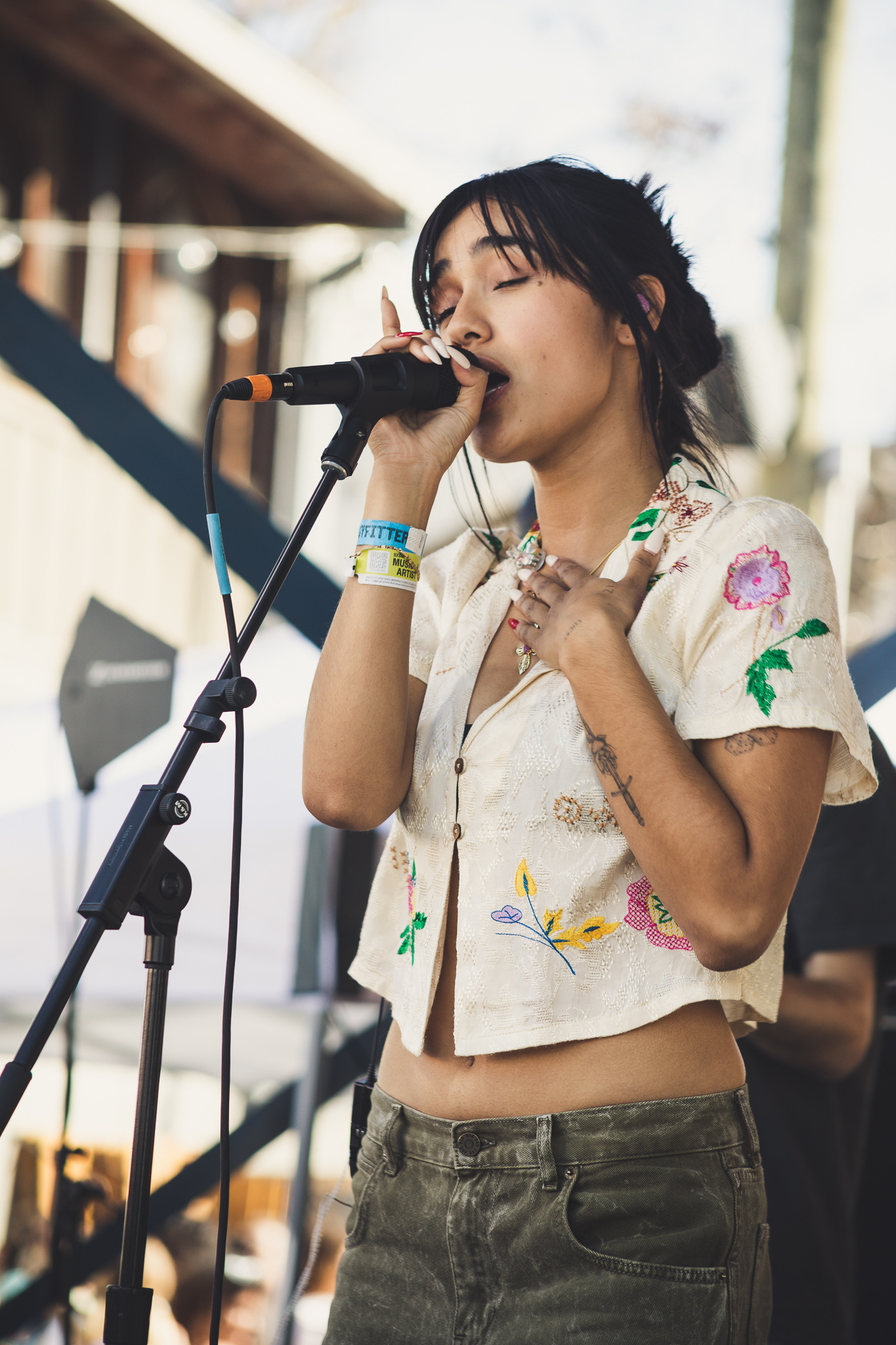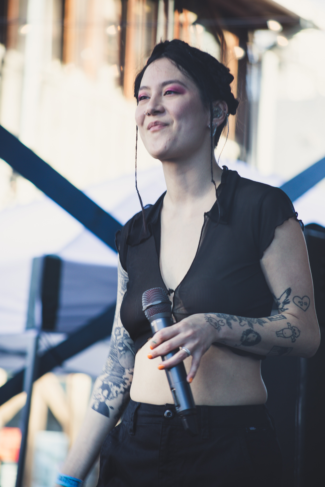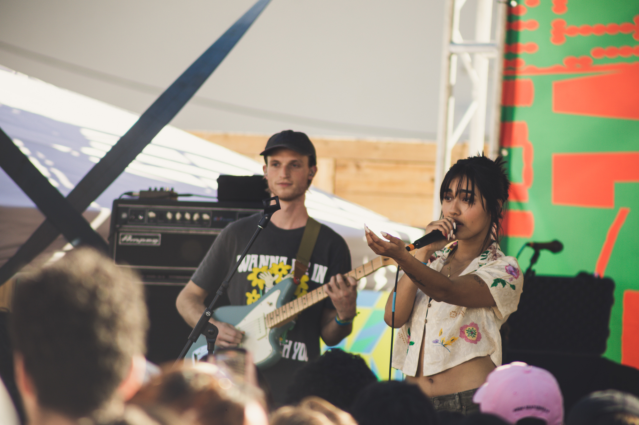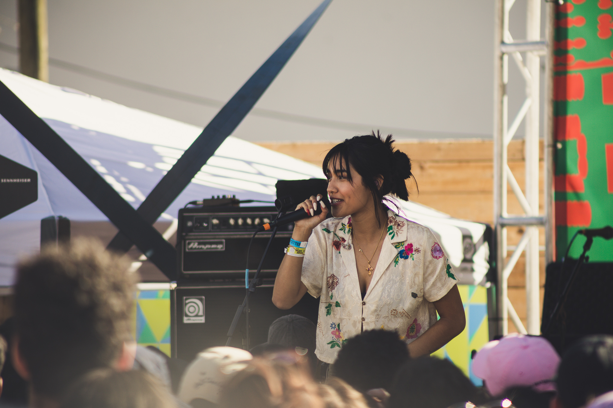 Consequently, Space 24 Twenty was shining with great vibes. The heat was bearing on everyone in the crowd, as everyone was eagerly waiting for Japanese Breakfast to take the stage. The Urban Outfitters showcase was the place to be, especially since they had lots of complimentary food and drinks, and lots of free goodies. The first artist of the evening was Baird, who played sweet jams to match the chill atmosphere as the venue filled up. After a short intermission, Niko Rubio put on a wonderful performance as she caught everyone’s attention with her powerful voice. Despite one of their guitar strings breaking before the last song, the show carried on and an exclamation that Niko Rubio “loves Japanese Breakfast.” After the venue hit capacity and the streets/parking garages outside of the space were full of people, Japanese Breakfast closed out the evening with an emotional performance that everyone seemed to resonate with.