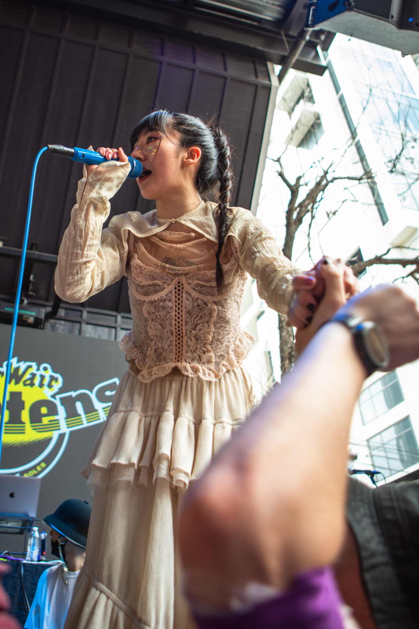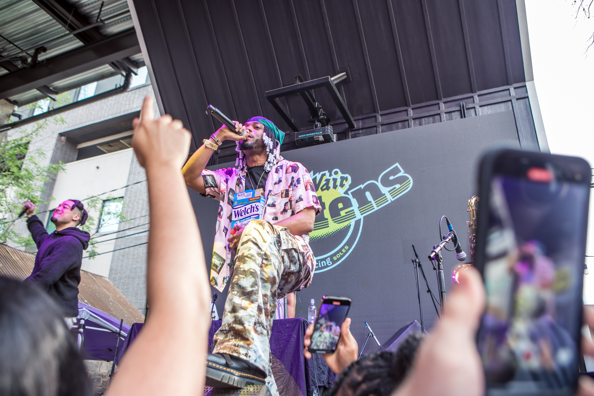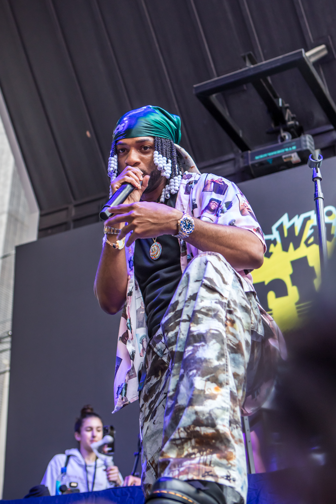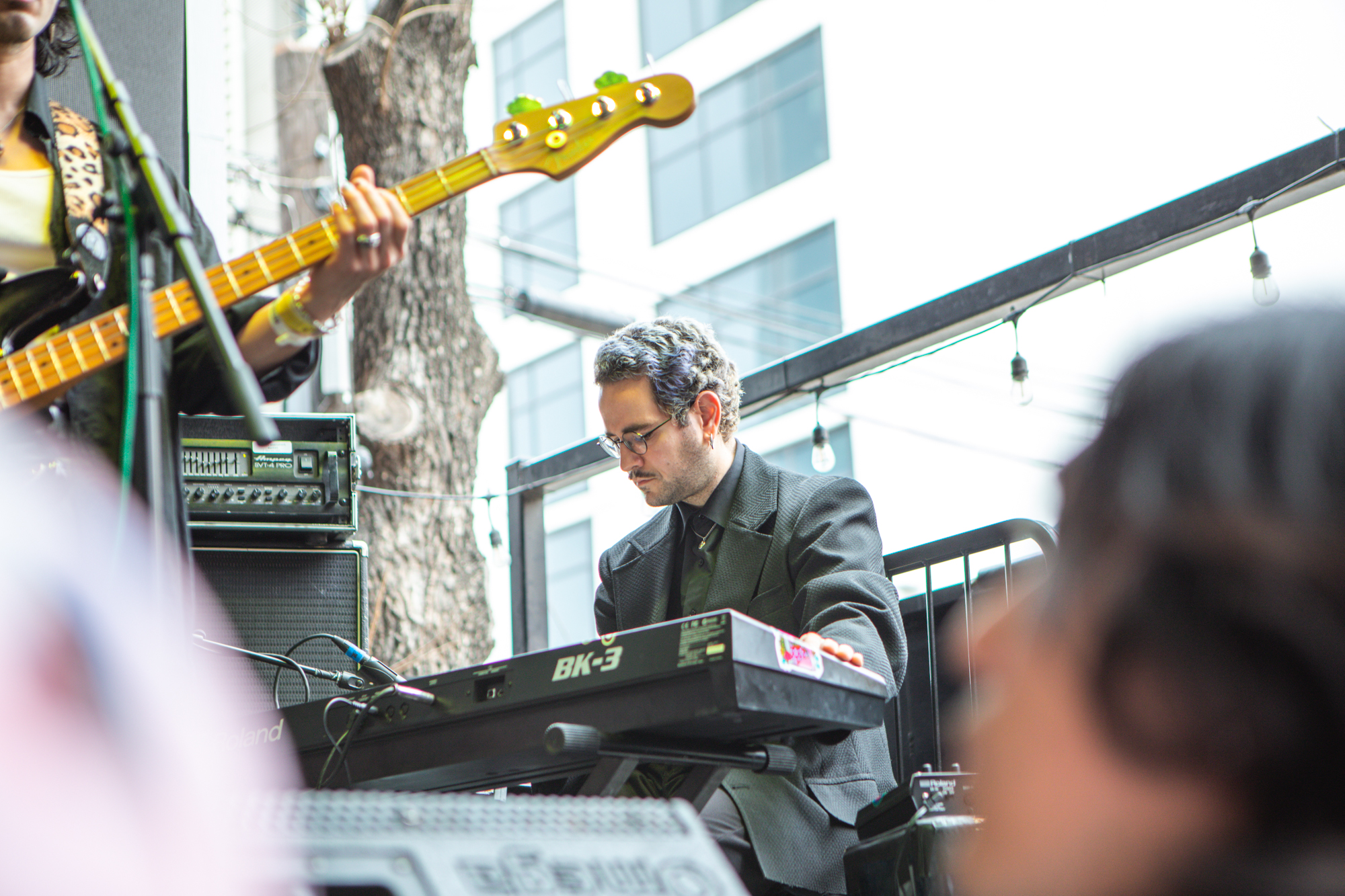 Our team arrived at the function in time to catch the last two songs from Lime Garden’s performance. The vibes were set to a bilingual set by the band Divino Niño from Chicago. Their set included songs from their newly released album, Last Spa on Earth including “Nos Soltamos” and “XO”. Japanese artist HARU NEMURI followed on stage where the scene quickly became a party as she invited three other artists to join her performance. Soon after, John the DJ continued to pump up the vibes as the crowd was endowed as a “family” and taught some dance moves while introducing Armani White. A fan traded his Biggie imprinted button-down for Armani’s pullover hoodie, while a saxophone player joined the stage to compliment the jams. – Emily Martinez and Keylee Paz